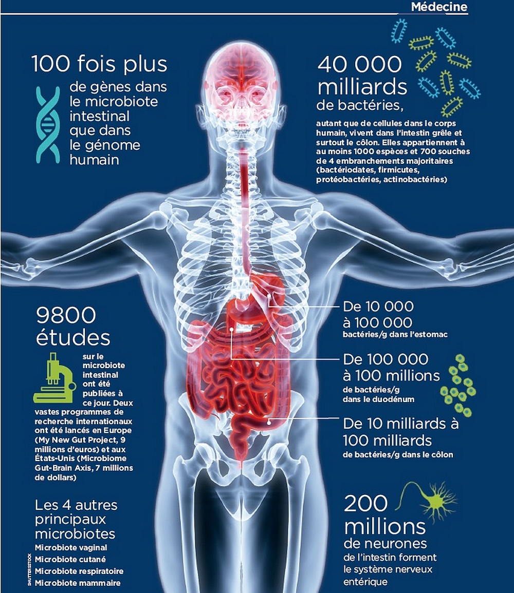 Selon l’Inserm, notre tube digestif abriterait pas moins de 1013 micro-organismes, soit autant que le nombre de cellules qui constituent notre corps.